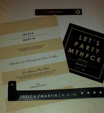 Allí se puede ver una tarjeta, en colores nude y blanco, que dice: "Jésica & Martín. Te invitamos a compartir este momento con nosotros. Sábado 8 de noviembre de 2014, 18.30 hs. La Marea Polo Club". Además, se adjunta una pulsera (al estilo hoteles all inclusive) que dice también "Jésica & Martín 8-11-14".