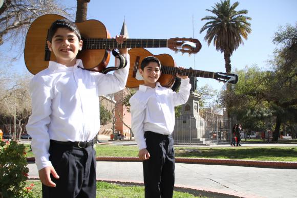 Impecables, de camisa blanca, pantalón negro y zapatos, cada uno con su guitarra, a la que apenas le sacan una cabeza. Alan y Alex Montero, son Los Mellis de Cuyo, tienen 9 años, son hermanos mellizos y comparten además la pasión por la música que les inculcó su abuelo, Alfredo Chávez, quien desde su juventud es cantor y compositor.