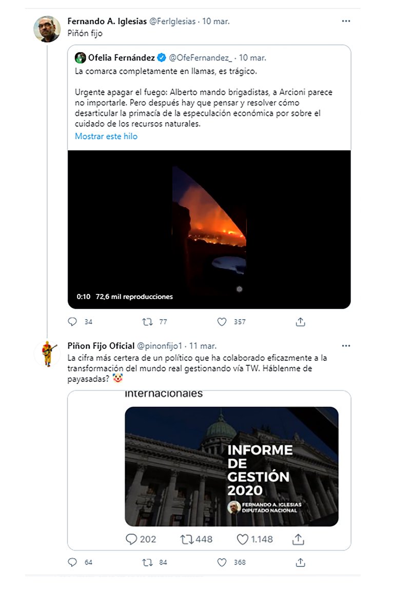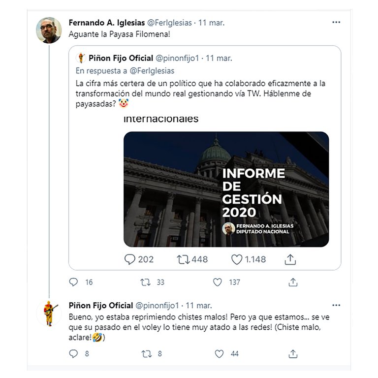 Luego del tuit de Fernández, su colega comentó: “Piñón Fijo”. Lo que derivó en la reacción del payaso cordobés que, al leer su nombre, no dudó en dirigirse al diputado. “La cifra más certera de un político que ha colaborado eficazmente a la transformación del mundo real gestionando vía TW. Háblenme de payasadas”, escribió el ídolo infantil junto con un breve informe de gestión 2020 del político que resumía: “7 proyectos de ley – 39 proyectos generales- 152 acompañamientos 18 sesiones – 77 votaciones – 66 reuniones de comisión 4 reuniones presidiendo la Comisión del Mercosur 5 denuncias penales – 2 denuncias internacionales”.