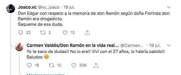 Carmen Valdés, es la hija de Ramón Valdés -conocido por protagonizar a Don Ramón en el Chavo del 8-. Desde hace un tiempo, suele compartir imágenes inéditas de su padre en su cuenta de Twitter para los fans de la exitosa serie. Pero hace poco, uno de sus seguidores le hizo una pregunta que la descolocó. Pero lejos de ignorarla, decidió responder para que no queden dudas.