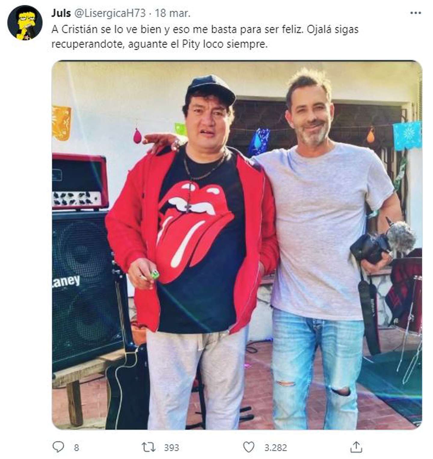 La fotografía fue publicada por la usuaria @lisergica en Twitter. “A Cristian se lo ve bien y eso me basta para ser feliz. Ojalá sigas recuperándote, aguante el Pity loco, siempre”, escribió en la red social.