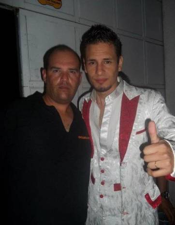 Esta foto tomada en noviembre del 2011, con el cantante de Ráfaga Rodrigo en la puerta de un boliche antes de dar un recital. Yo me encontraba promocionando un evento que se realizó ese mes junto a las promotoras y justo Rodrigo bajaba de la combi. Como nos conocemos, porque también trabajo en seguridad y conozco a varios artistas, me acerqué a saludarlo; todo de primera, espectacular el vago.