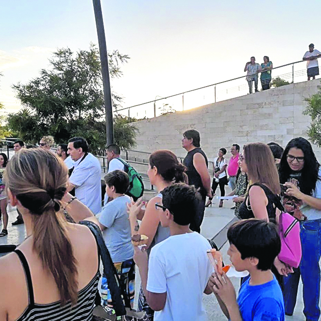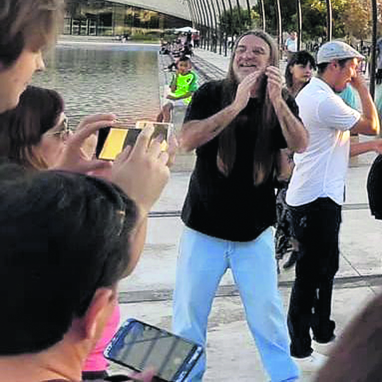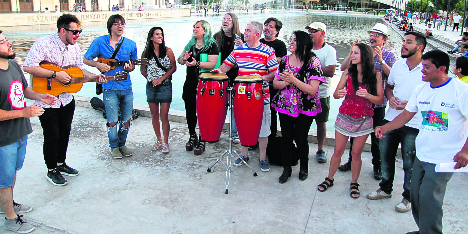 En el extremo norte de la fuente, con el diáfano cielo sanjuanino y la fachada del Teatro del Bicentenario como espectacular fondo, el grupo de artistas sanjuaninos de diversos géneros convocados por Francisco Lathi, sumaron sus voces a las de sus pares de todo el país, en un gran coro sin fronteras. Familias y jóvenes que disfrutaban de un descanso en la plaza se acercaron a escuchar, atraídos por la música, y luego se fueron sumando otras personas -no tantas como se hubiera querido, lamentablemente-, con lo que el grupo decidió cantarla varias veces más.