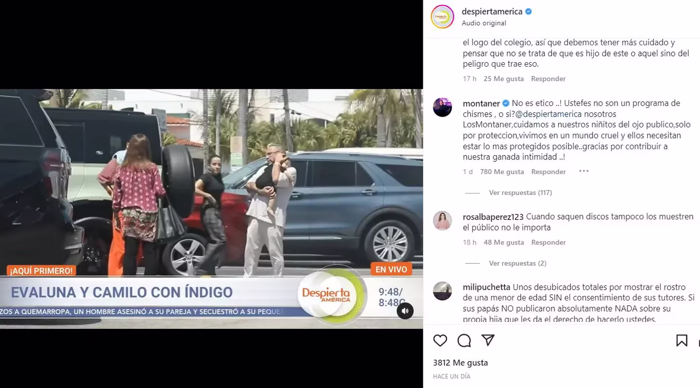 Los fanáticos del ciclo no tardaron en encararlo: le pidieron que se ubique y le advirtieron que para no salir en los medios tenía que quedarse encerrado en la casa. “Bajate del pony”, “Cuando saque un disco tampoco lo muestren porque a nadie le importa”, “Ni Cristiano Ronaldo se animó a tanto”, “Qué ridículos los Montaner”, fueron algunas de las quejas que se leyeron. Camilo Echeverry y Evaluna Montaner, los padres de la nena, también prefieren resguardarla, aunque su rostro ya se viralizó hace rato.