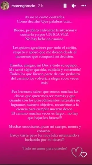 "Ay, no sé cómo contarles, ¿cómo decirlo? Qué palabras usar…. Bueno, prefiero enfrentar la situación y contarlo yo por única vez. No hay bebé en camino", transmitió Marengo en sus historias de Instagram.