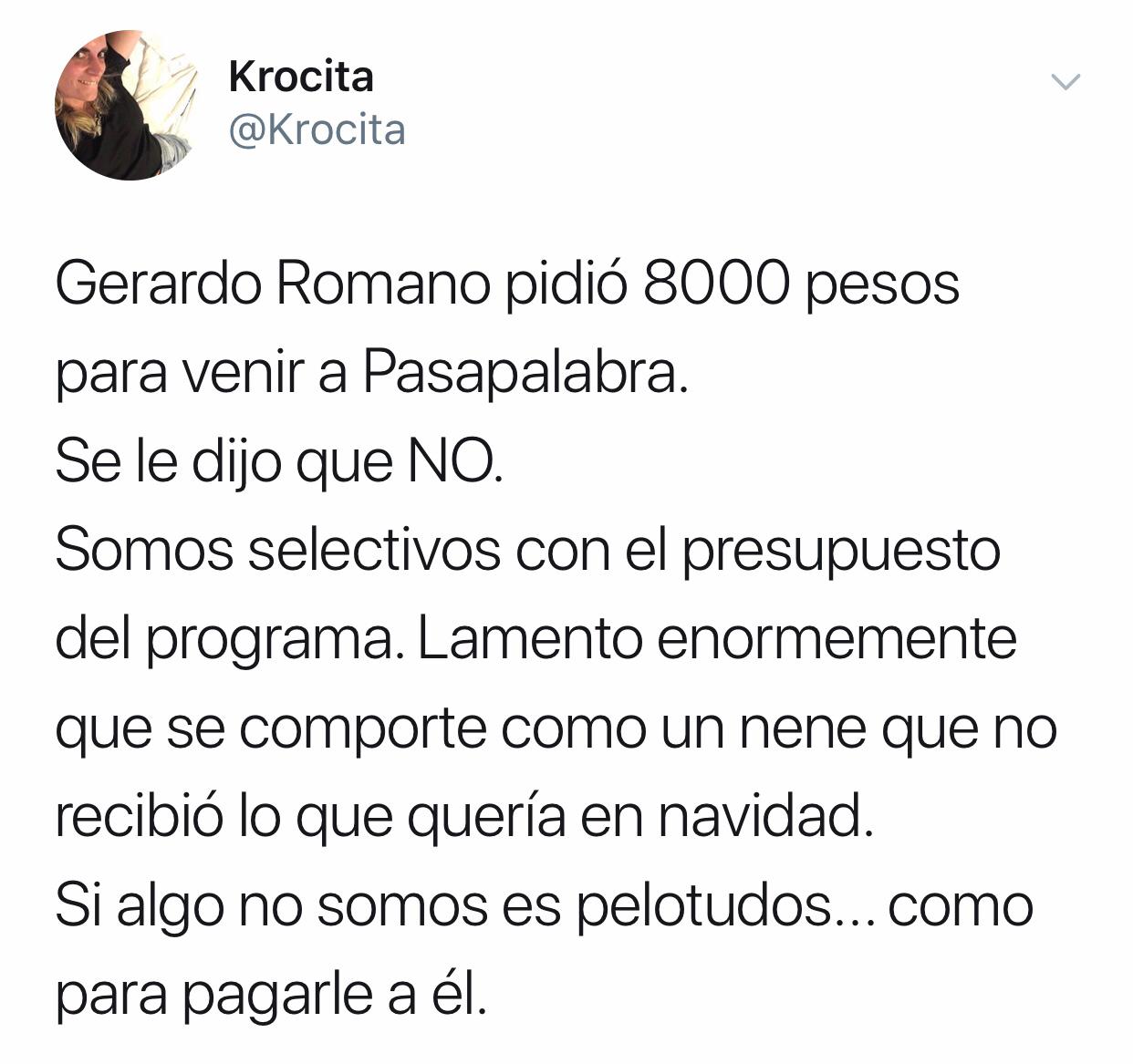 Sin embargo, rápidamente recibió la réplica de la productora ejecutiva del programa conducido por Iván de Pineda, quien destrozó al actor: “Gerardo Romano pidió $8.000 para venir a Pasapalabra. Se le dijo que NO. Somos selectivos con el presupuesto del programa. Lamento enormemente que se comporte como un nene que no recibió lo que quería en navidad. Si algo no somos es pelotudos… como para pagarle a él".