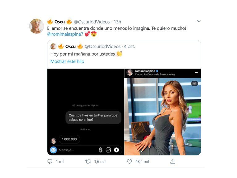 "Hoy por mí, mañana por ustedes”, le pidió el youtuber Oscu a sus seguidores. El joven necesitaba un millón de likes para concretar una cita con Romina Malaspina, según la ex Gran Hermano le había prometido. Para sorpresa de todos, incluso de él, llegó a la cifra.