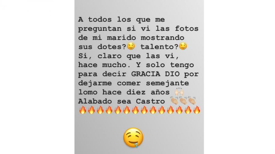 “A todos los que me preguntan si vi las fotos de mi marido mostrando sus dotes, ¿talento? Sí, claro que las vi, hace mucho”, comenzó Sabrina su historia en Instagram, junto con unos emojis en los que a la carita se le cae la baba. Luego siguió: “Y solo tengo para decir ‘Gracias Dio’ por dejarme comer semejante lomo desde hace diez años. Alabado sea castro”.