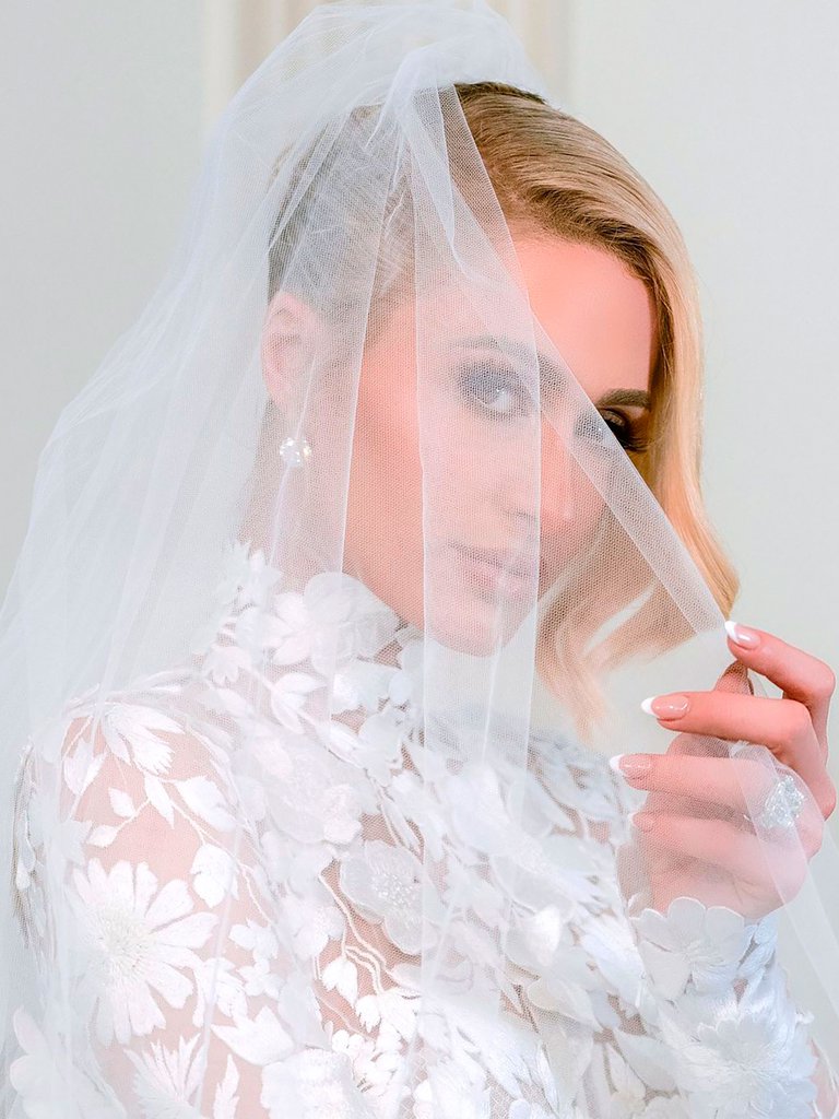 “Mi para siempre comienza hoy… 11/11 #JustMarried #ForeverHiltonReum”, escribió la novia, que no estrenó su alianza pero sí mostró su impresionante anillo de compromiso a la cámara mientras se tapaba la cara con el velo.