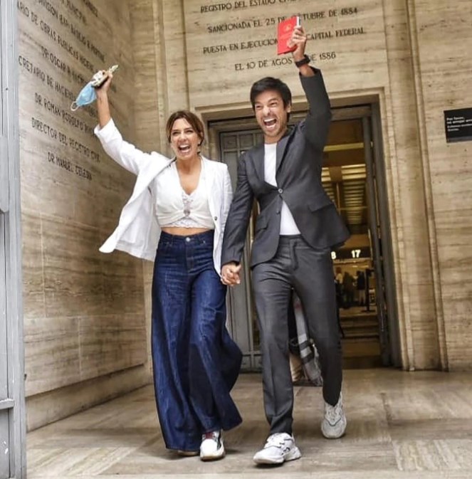 En su cuenta de Instagram, El Chino compartió fotos y videos de este momento inolvidable en su vida. En una emotiva imagen, los novios aparecen en la puerta del Registro Civil, celebrando ser marido y mujer con la famosa libreta roja. Él optó por un look informal y descontracturado que llamó la atención de sus seguidores: un traje gris, con remera y zapatillas. Mientras que ella también eligió un outfit súper cómodo: un top y un blazer de color blanco, unos jeans súper amplios y zapatillas.
