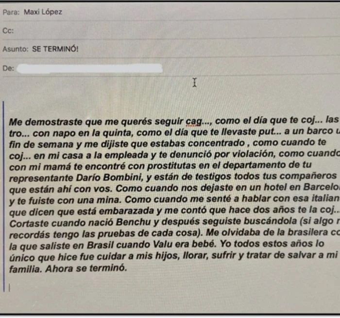 Luego sigue: "Yo todos estos años lo único que hice fue cuidar a mis hijos, llorar, sufrir y tratar de salvar a mi familia. Ahora se terminó. Me demostraste que me querés seguir cagando, como el día que te cog… las tro… con N… en la quinta, como el día que te llevaste put… a un barco un fin de semana y me dijiste que estabas concentrado, como cuando te cog… en mi casa a la empleada y nos denunció por violación".