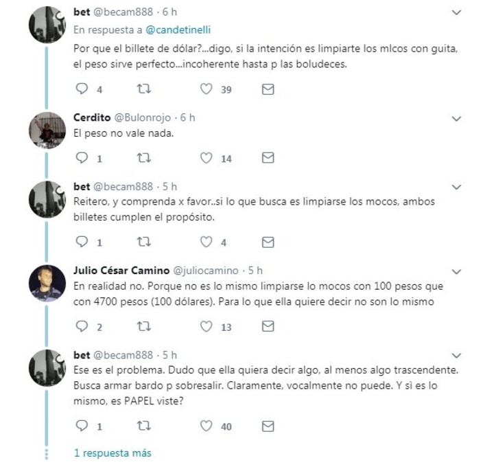 Las redes sociales se volvieron a llenar de fuertes críticas a Candelaria Tinelli, luego de que la cantante publicara una foto limpiándose la nariz con un billete de 100 dólares.