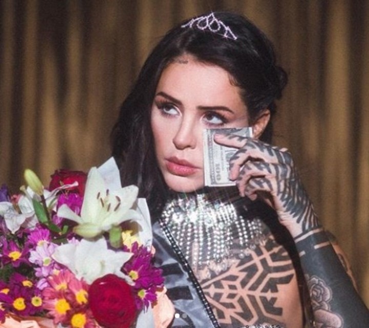 "Hater Queen" (Reina de Odiadores) dice la banda que luce Cande en las fotos, refiriendo a los constantes comentarios negativos que suele recibir en las redes.