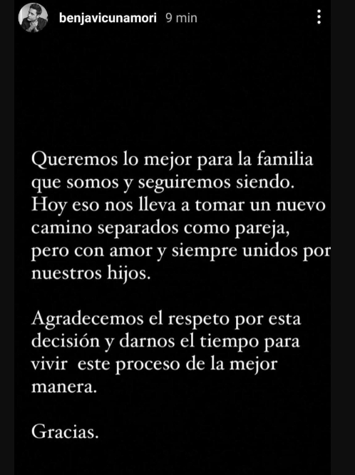 “Queremos lo mejor para la familia que somos y seguiremos siendo. Hoy eso nos lleva a tomar un nuevo camino separados como pareja, pero con amor y siempre unidos por nuestros hijos”, comenzó diciendo el galán chileno.