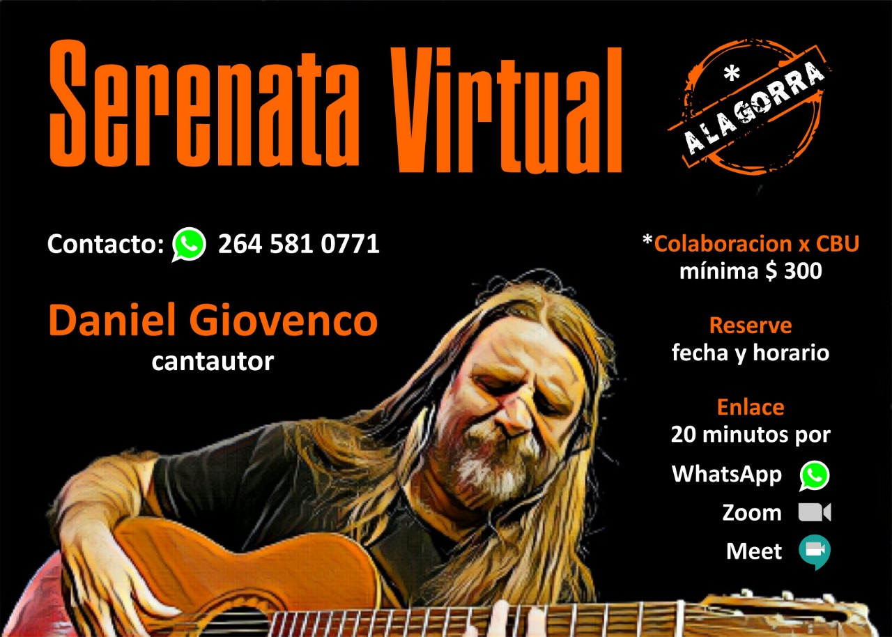 Daniel realizará las serenatas virtuales "a la gorra" con un piso de $300 y en su repertorio incluirá todo el material que él mismo ha creado en su carrera artística. "Necesitamos unos pesos pero respetando la delicada situación que atravesamos", destacó. La duración es de 20 minutos y podrá realizarse mediante Whatsapp, Zoom o Meet. Además, las contrataciones pueden hacerse al 2645810771 y en ese momento, se pacta día y horario.