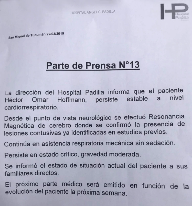 Según indica el nuevo parte médico, el cantante de 70 años "persiste estable a nivel cardiorrespiratorio". "Desde el punto de vista neurológico se efectuó Resonancia Magnética de cerebro donde se confirmó la presencia de lesiones contusivas ya identificadas en estudios previos. Continúa en asistencia respiratoria mecánica sin sedación. Persiste en estado crítico, gravedad moderada", detalla el informe que difundió el hospital este viernes, y aclararon que la próxima semana habrá uno nuevo.