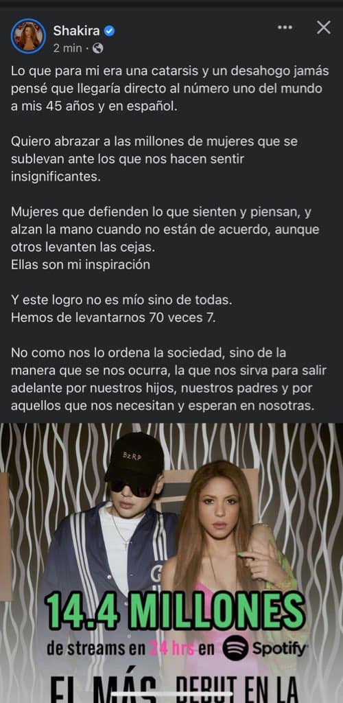 Hace unas horas la cantante Shakira publicó en su cuenta personal de Instagram un agradecimiento por todo el apoyo recibido luego de la publicación de su nuevo tema. La canción escrita en colaboración con el artista Bizarrap fue lanzada al publico el miércoles por la noche y rápidamente se volvió uno de los más escuchados en Spotify y de los videos más vistos en YouTube, con más de 80 millones de reproducciones.