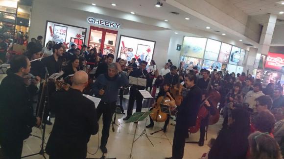 Como lo hizo otras veces, La Camerata San Juan se presentó en un espacio público, llevando la música a lugares no tradicionales. El viernes por la tarde causaron sensación en el Hiper Libertad, donde lograron captar la atención de gran cantidad de público que a esa hora paseaba por el centro comercial.
