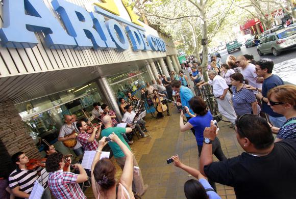 En un recorrido por varios medios de comunicación de la ciudad, La Camerata San Juan llevó lo mejor de su repertorio a la puertas de DIARIO DE CUYO como muestra de agradecimiento por la difusión de sus actividades culturales a lo largo de todo el año. La vereda de la calle Mendoza antes de Santa Fe fue copada por todos los instrumentistas de la orquesta de cámara, dirigida por el Maestro Gustavo Plis Steremberg. Muchos peatones se acercaron con curiosidad para escuchar las sinfonías de los violines y de los saxos. Un ciclista detuvo su marcha y contempló el pequeño e improvisado recital. Algunos niños quedaron asombrados por el inusual momento que se vivió en pleno centro.