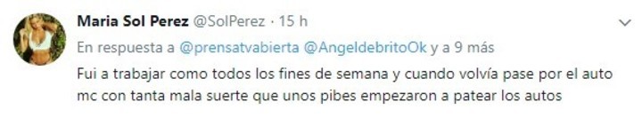 “Fui a trabajar como todos los fines de semana y cuando volvía pase por el auto mc con tanta mala suerte que unos pibes empezaron a patear los autos”, comenzó explicando “la sobri de Pérez”, como también se la conocen en la televisión y el mundo virtual.