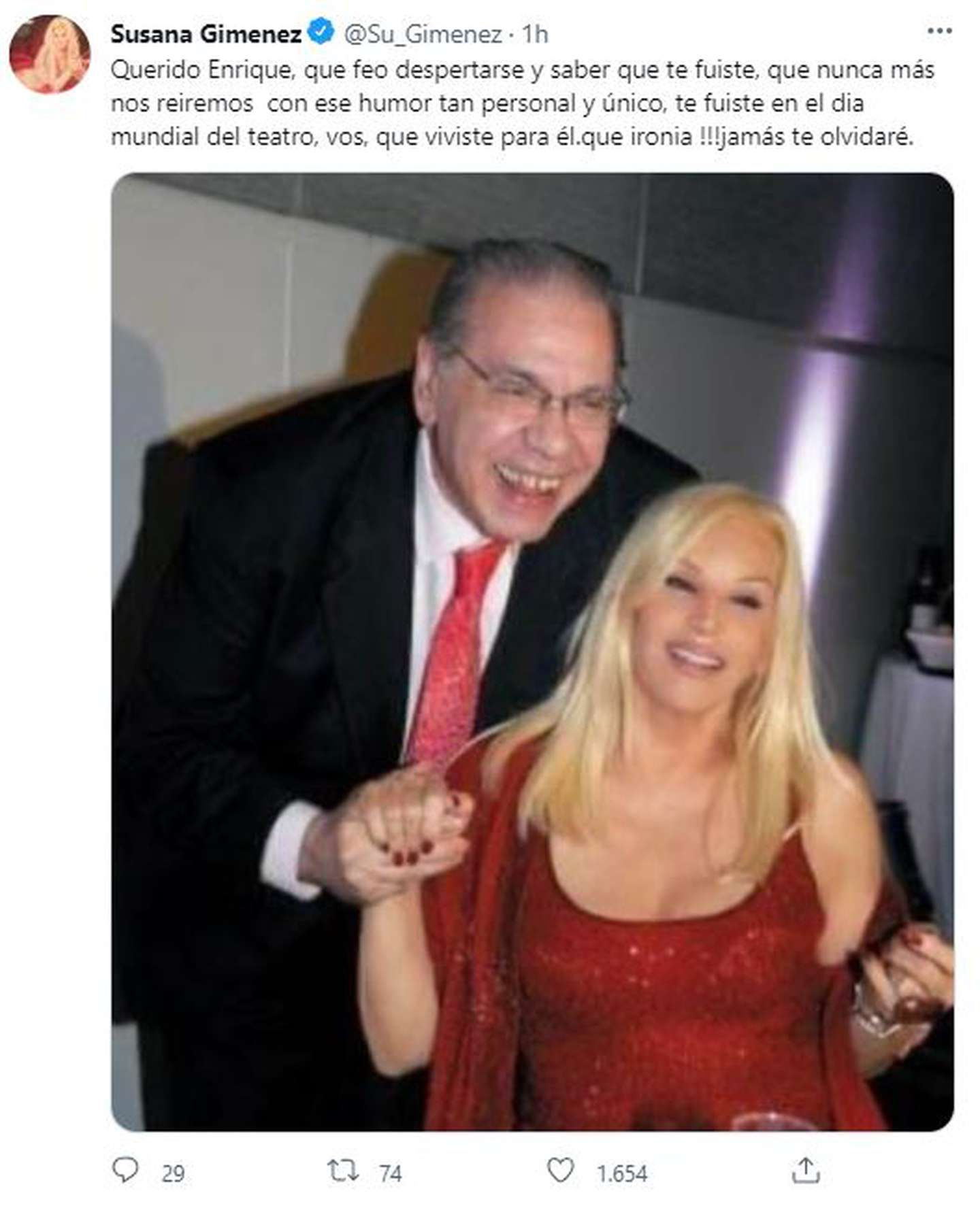 En su cuenta de Twitter, la diva de los teléfonos expresó su tristeza y recordó la gran relación que mantenían: “Querido Enrique, qué feo despertarse y saber que te fuiste, que nunca más nos reiremos con ese humor tan personal y único”.