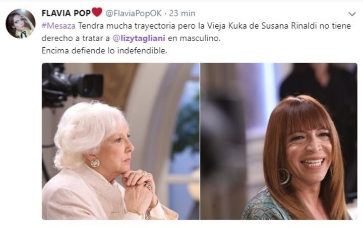 "@lizytagliani mucha altura para contestarle a Susana Rinaldi. Qué mal educada y soberbia. Pobre mujer. Te banco, Lizy, sos LA mejor", "Tendrá mucha trayectoria pero la Vieja Kuka de Susana Rinaldi no tiene derecho a tratar a @lizytagliani en masculino…".