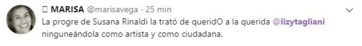 "La progre de Susana Rinaldi la trató de queridO a la querida @lizytagliani ninguneándola como artista y como ciudadana" y "Que señora irrespetuosa la ‘gran’ Susana Rinaldi eh, le pese a quien le pese @lizytagliani es una señora, y como lo pudimos observar, una señora mucho mas respetuosa y humilde que esta mujer mal educada", fueron sólo algunos de los comentario en contra de la actriz.