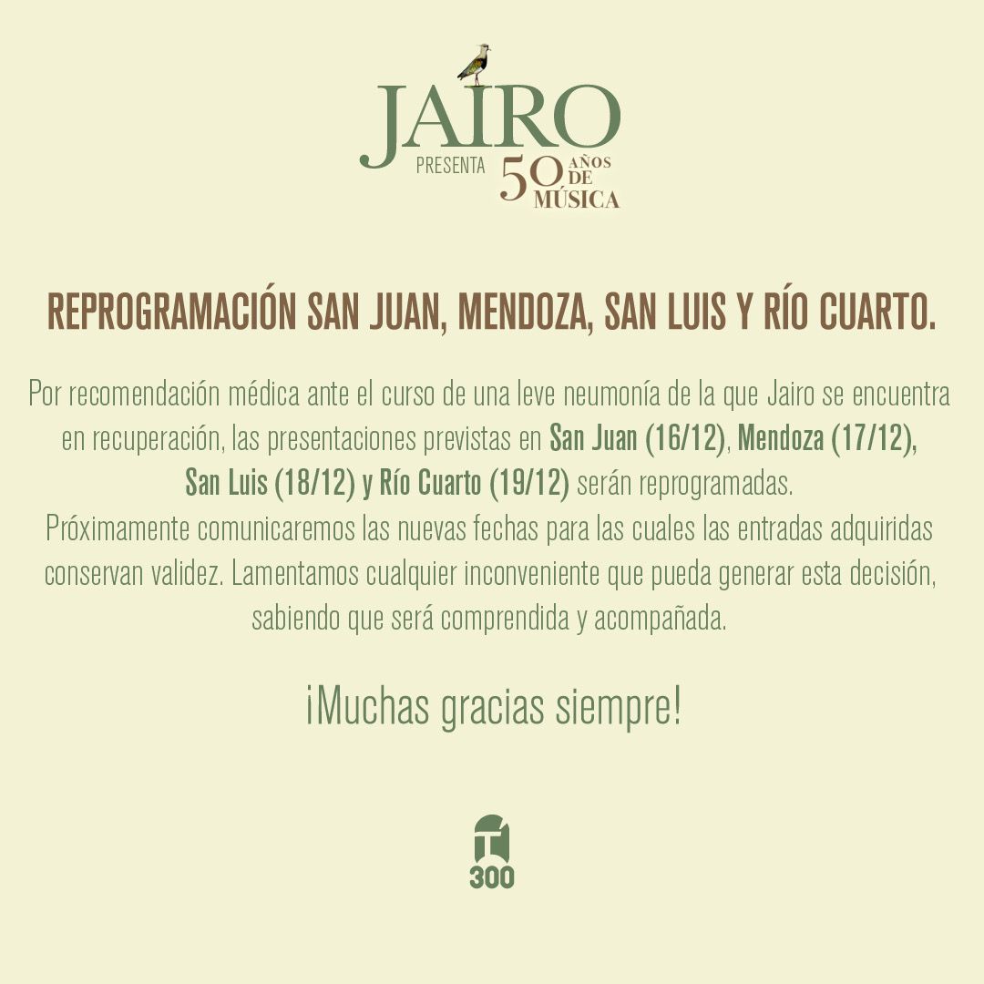 "Por recomendación médica ante el curso de una leve neumonía, de la que Jairo se encuentra en recuperación las presentaciones previstas en San Juan Mendoza, San Luis y Río Cuarto serán reprogramadas. Próximamente, comunicaremos las nuevas fechas para las cuales las entradas adquiridas conservan validez", expresa el comunicado.