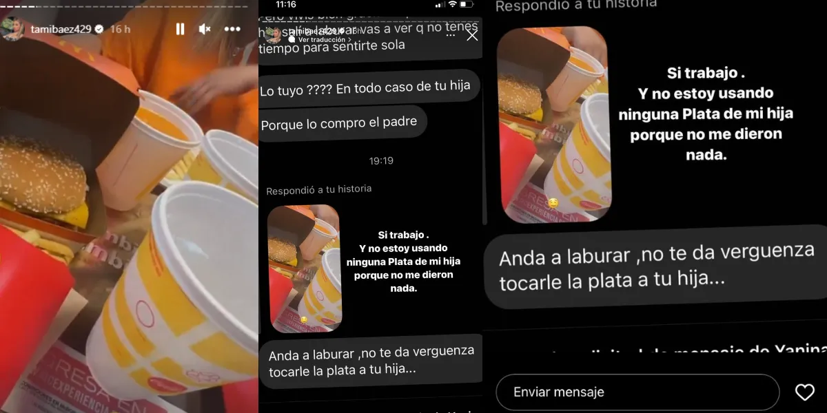 “Andá a laburar. ¿No te da vergüenza tocarle la plata a tu hija?”, le dijo una seguidora, pero ella no se quedó callada. “Si trabajo, y no estoy usando ninguna plata de mi hija porque no me dieron nada”, disparó involucrando al artista, de quien todavía espera un monto mensual para los gastos de la beba de un año.