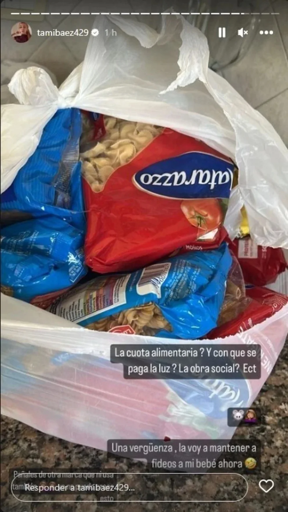 En la historia Tamara escribió: “¿La cuota alimentaria? ¿Y con qué se paga la luz, la obra social, etc?”, junto con un emoji de un ratón. Además escribió de manera irónica, “una vergüenza, la voy a mantener a fideos a mi bebé ahora”, enojada la ex-pareja del cantante.
