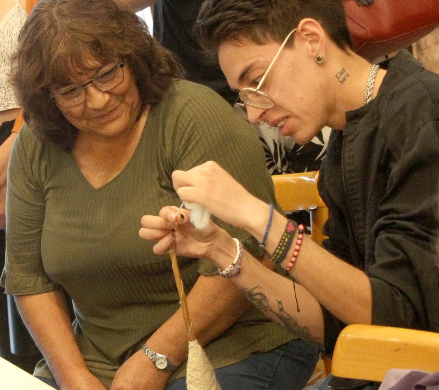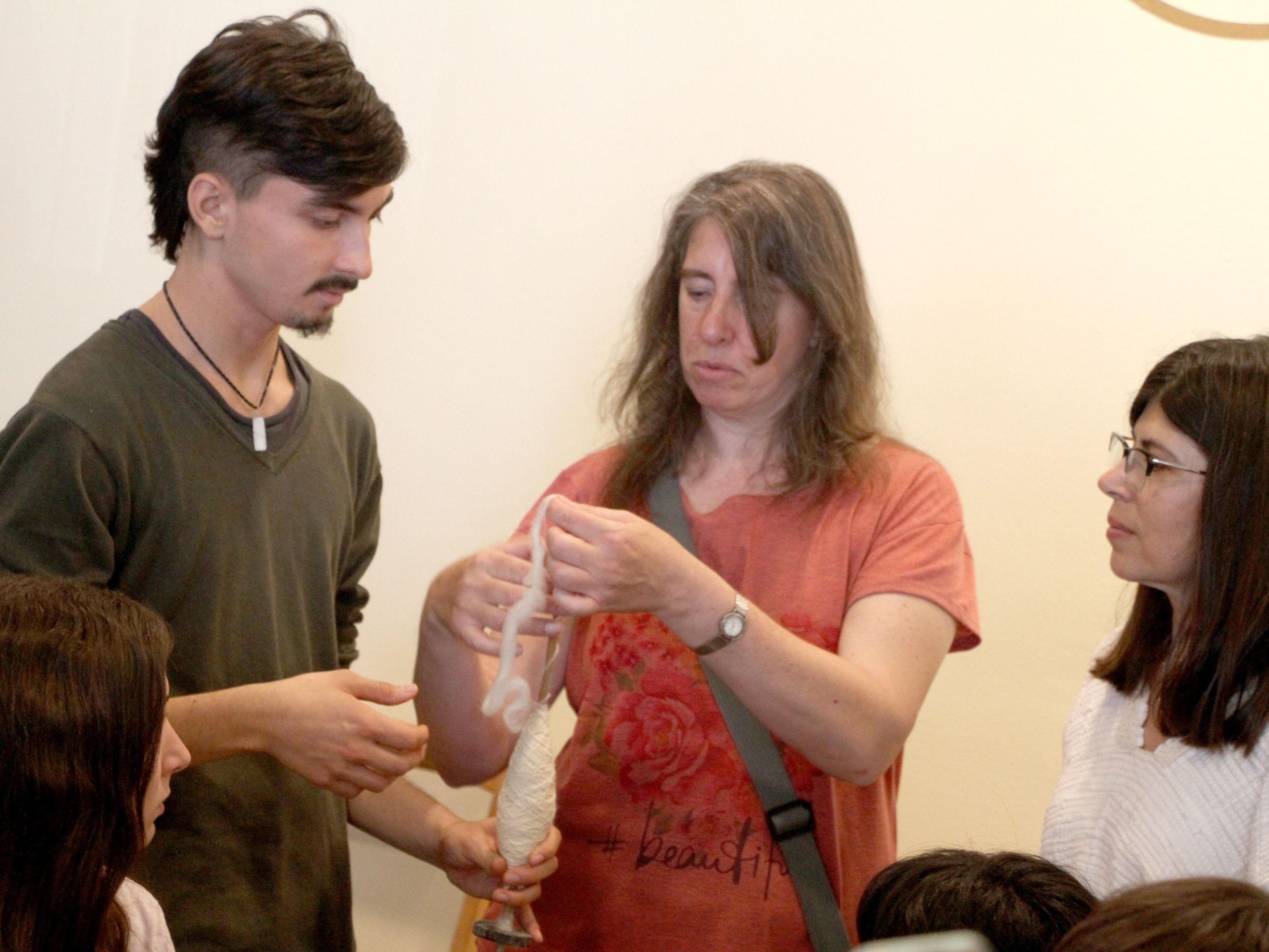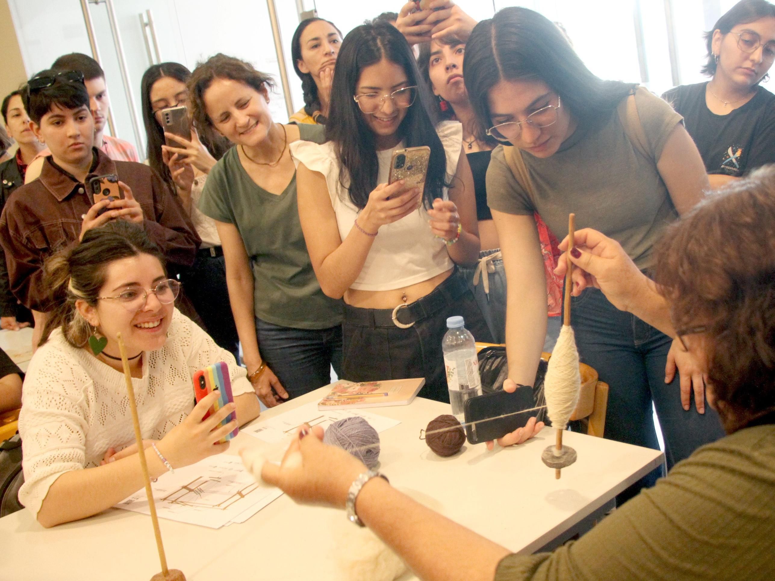 "¿Quién quiere hilar?" pasó la posta la experimentada Clara Quiroga y un chico que ocupó el lugar a su lado puso en práctica lo que había observado atentamente. "Si voy muy lento, ¡perdón! Peor es nada" sonrió el joven estudiante sin sacar la vista del hilo que iba formando con sus dedos. "¿Hay que ir girándolo? ¡Es re difícil esto!", acotó una jovencita absorta en la misma tarea. A su alrededor, sus pares miraban con atención, sacaban fotos y grababan con sus celulares, al tiempo que Clara les iba dando algunos consejos. Fue una de las escenas que se vivió ayer en el Museo de Bellas Artes Franklin Rawson, que dirige Emanuel Díaz Ruiz; que a través del área Educación -con Natalia Quiroga- y en conjunto con el Mercado Artesanal Tradicional Luisa Escudero y el Instituto de Investigaciones Arqueológicas y Museo Mariano Gambier, propició el encuentro entre calificadas tejedoras y alumnos de la cátedra Textilería del departamento de Artes Visuales de la FFHA, que dictan Graciela Pérez y Valentina Fojo. Reunión que se concretó nada casualmente al ingreso de la muestra Arqueología del Sentir (Bienal Sur), que vincula arte, artesanía y arqueología e incluye obras de las artesanas que se dieron cita.