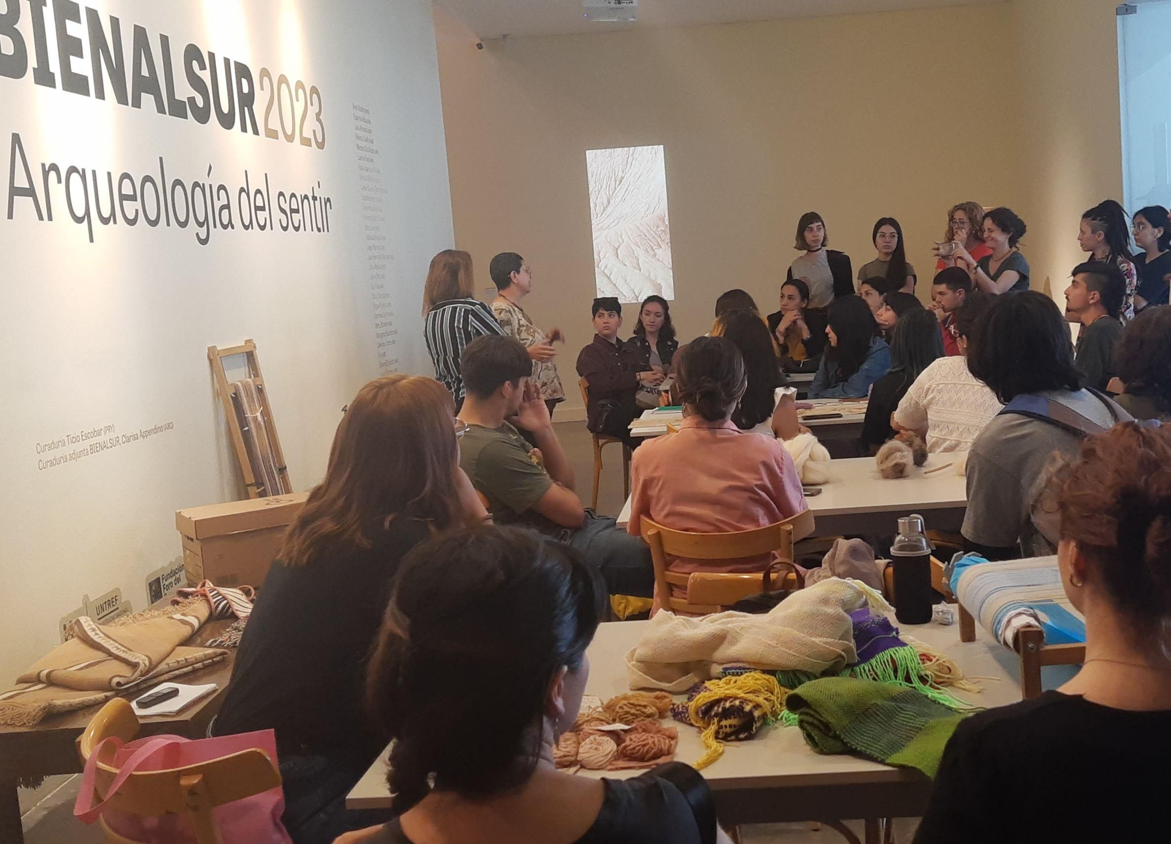 Tras un recorrido por la muestra y charlas de Gabriela Riveros (artista visual) y Lorena Re (Museo Gambier), se profundizó el cara a cara de los jóvenes con las artesanas, Clara, Mara Luna y María Eugenia Alba -acompañadas por la directora del Mercado Artesanal, Miriam Atencio- cuyo objetivo era la transmisión de saberes y técnicas de la textilería ancestral sanjuanina. El teñido de las lanas, el hilado y el trabajo en telar atraparon a los futuros artistas, que mostraron algo de lo que aprenden en la facultad (tramas, tintes, costura) y pudieron visualizar todo el proceso que conlleva una pieza. En ese camino, tuvieron la posibilidad de conocer a sus autoras y sobre todo "el honor" de recibir de ellas el saber hacer transmitido desde tiempos remotos. Y si en algo coincidieron todos, es que este tipo de vivencias no sólo les deja a las nuevas generaciones el secreto de una técnica o la semilla de una vocación; sino que sobre todo les enseña a valorar y a apreciar el trabajo y los conocimientos que una pieza encierra.