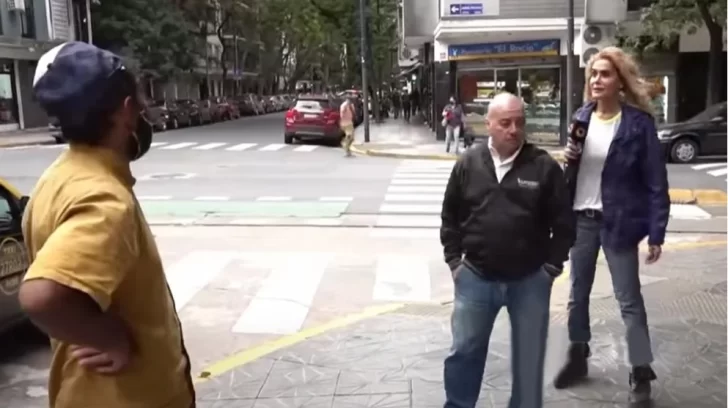 “¡Mirá, mirá! ¿Los tenés? ¡No me saquen del aire!”, exclamó Giuliana, al tiempo que el hombre hacía un gesto con la palma en alto, en señal de “cobrarle” algo. La conversación resultó inaudible por parte del desconocido, pero la movilera mantuvo el micrófono en alto para que se oyera su respuesta. Tratando de alejarse del hombre, dando algunos pasos hacia atrás, le pidió: “¡Cortala porque la calle no es tuya! Esto es espacio público, yo puedo estar acá porque la vía pública”.