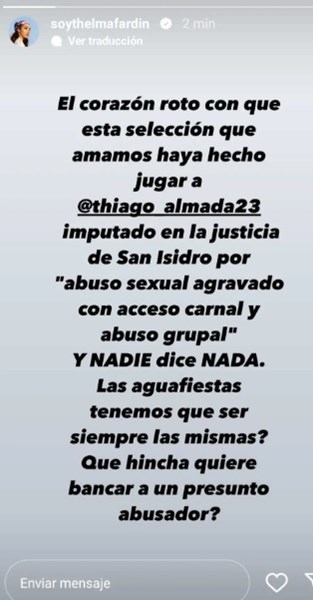 "El corazón roto con que esta Selección que amamos haya hecho jugar a Thiago Almada imputado en la Justicia de San Isidro por ‘abuso sexual agravado con acceso carnal y abuso grupal’ y nadie dice nada", escribió la actriz en redes sociales.