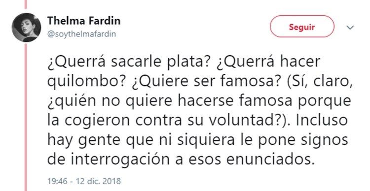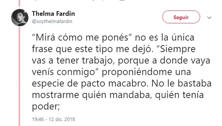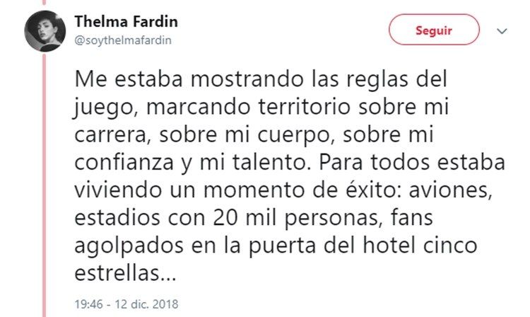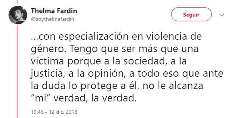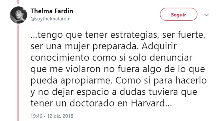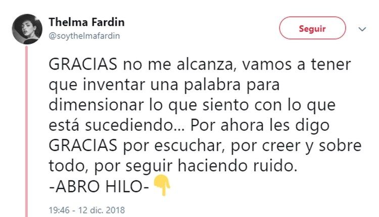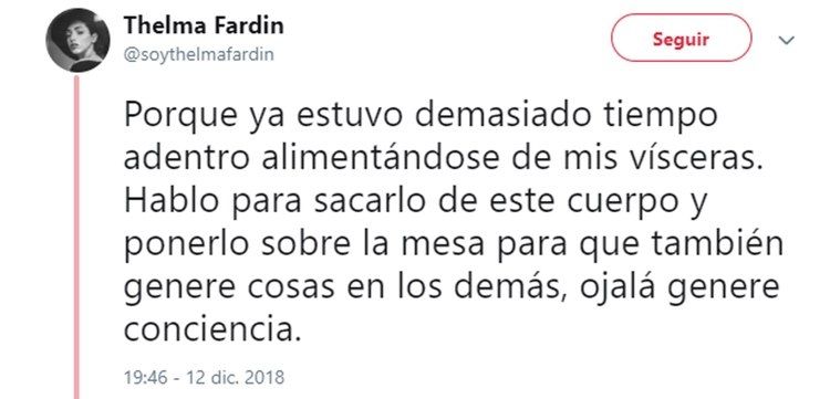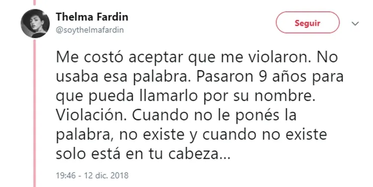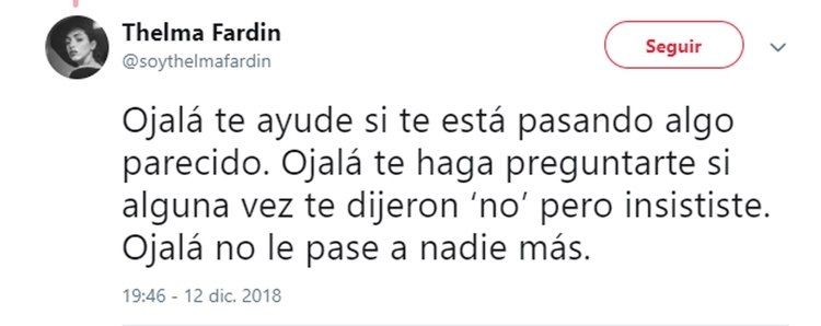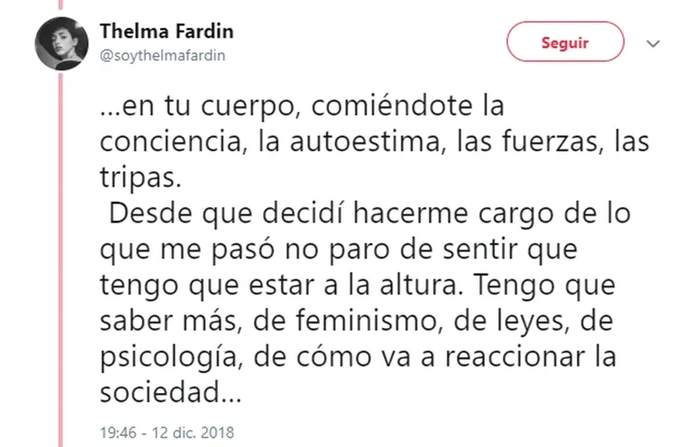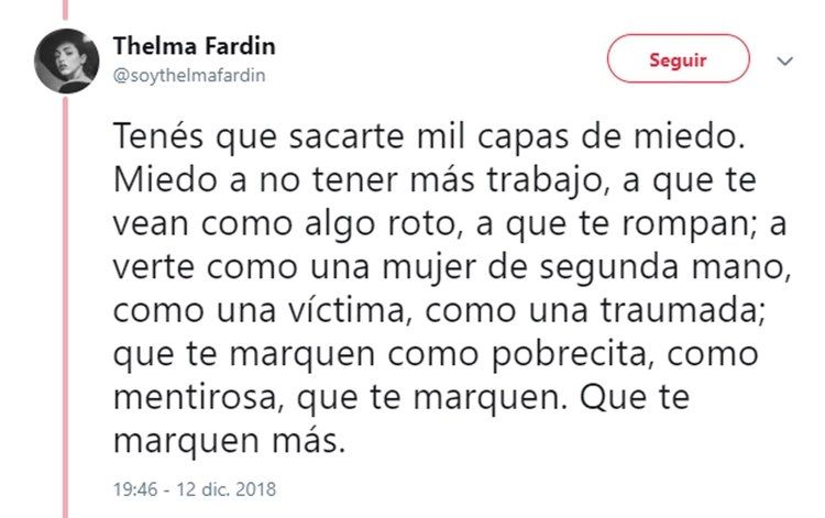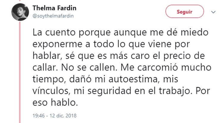 Luego de su dramático testimonio de ayer, en el que reveló que fue violada por Juan Darthés durante una gira con Patito Feo, Thelma Fardín se volcó a su cuenta de Twitter para profundizar sus sensaciones luego de un día tan movilizante para ella.