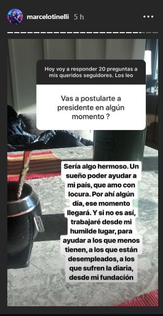 "Sería algo hermoso. Un sueño poder ayudar a mi país, que amo con locura. Por ahí algún día, ese momento llegará. Y si no es así trabajaré desde mi humilde lugar, para ayudar a los que menos tienen, a los que están desempleados, a los que sufren la diaria, desde mi fundación", contestó.