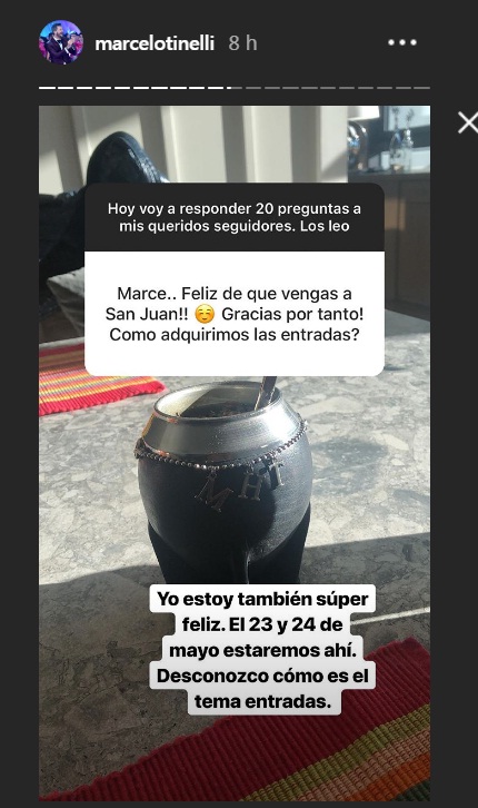 Marcelo Tinelli utilizó las redes sociales para contestar preguntas de su fans. El conductor recurrió a las historias de Instagram para interactuar con sus seguidores. Una de las preguntas apuntaban a su llegada a San Juan, principalmente sobre la adquisición de entradas para el ver el concurso "Genios de la Argentina".