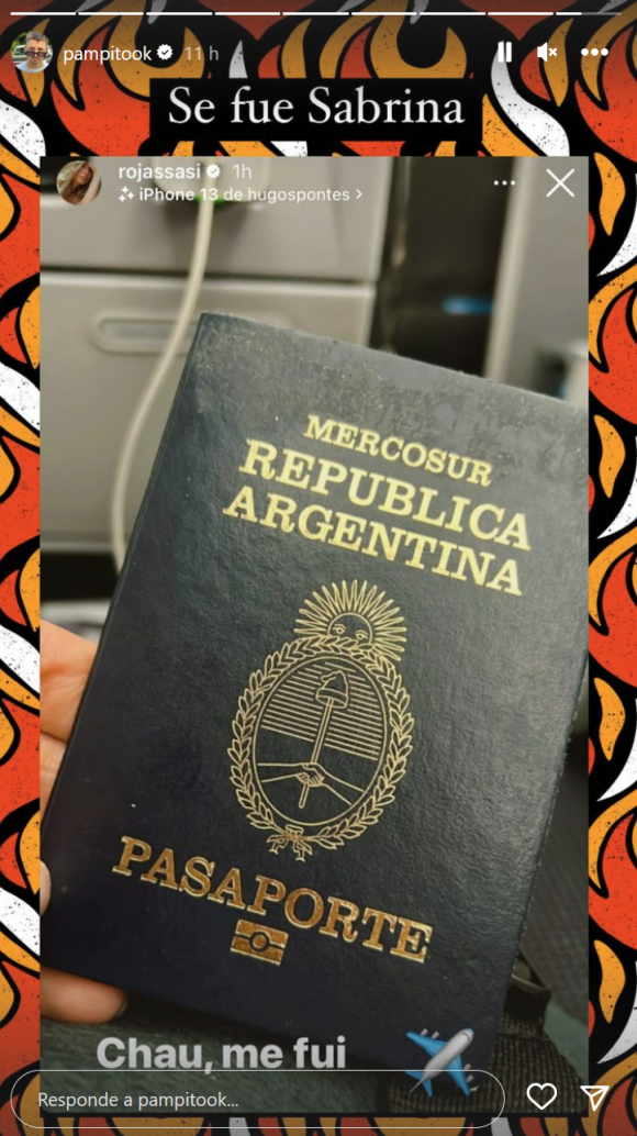 Fue Pampito quien hizo eco de una contundente storie de Sabrina desde el aeropuerto. "Chau, me fui", sentenció la modelo junto a la imagen de su pasaporte, sin contar el destino elegido en el que se refugiará tras su dolorosa separación.