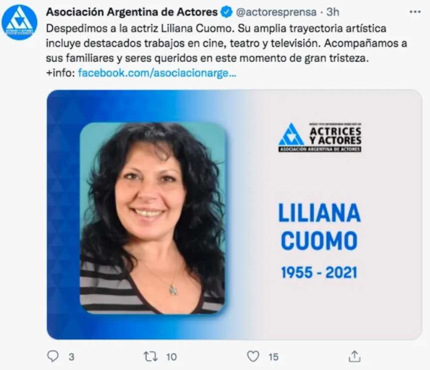 “Despedimos a la actriz Liliana Cuomo. Su amplia trayectoria artística incluye destacados trabajos en cine, teatro y televisión. Acompañamos a sus familiares y seres queridos en este momento de gran tristeza”, expresó la Asociación de Actores, quien confirmó la información con este comunicado.
