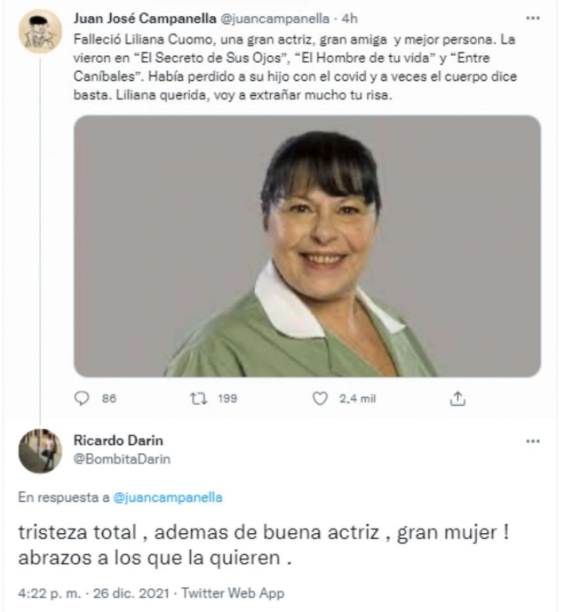 Por otro lado, Juan José Campanella se mostró conmovido al enterarse de su deceso: “Falleció Liliana Cuomo, una gran actriz, gran amiga y mejor persona. La vieron en El Secreto de sus Ojos, El Hombre de tu vida y Entre Caníbales. Había perdido a su hijo con el Covid y a veces el cuerpo dice basta. Liliana querida, voy a extrañar mucho tu risa”, expresó el director a través de su cuenta de Twitter, con una imagen en la que se observa una sonriente Liliana.