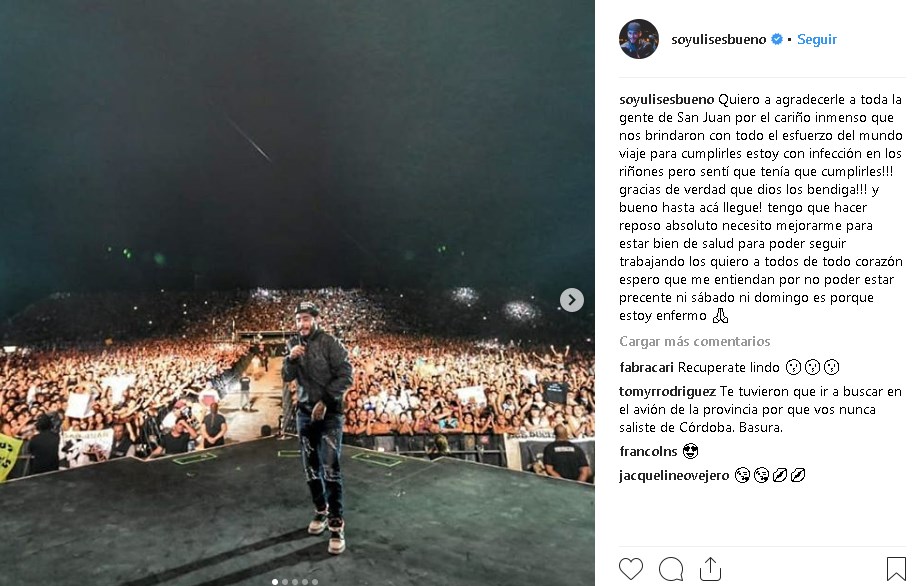 Cabe resaltar que en el último mes suspendió algunos conciertos por una infección en los riñones. "Quiero a agradecerle a toda la gente de San Juan por el cariño inmenso que nos brindó. Y bueno hasta acá llegué", expresó en sus redes sociales dando a entender que no podía seguir cantando hasta recuperarse.