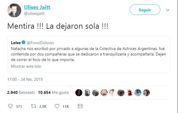 "Natacha nos escribió por privado a algunas de la Colectiva de Actrices Argentinas, fue contenida por dos compañeras que se dedicaron a tranquilizarla y acompañarla. Dejen de correr el foco de lo que importa", publicó Fonzi en redes sociales. Sin embargo, Ulises Jaitt, hermano de la actriz, le salió al cruce. "¡Mentira, la dejaron sola!", le respondió en Twitter. Su comentario le valió miles de retuits.
