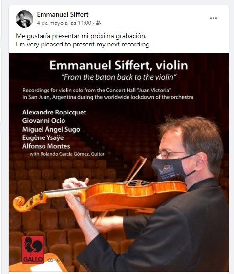 Luego de casi 20 años de actividad profesional como director de orquesta, el reencuentro con el instrumento de cuerdas con el que estudió la mayor parte de su vida, fue un hecho que lo entusiasmó: "Cuando la orquesta no pudo trabajar en marzo de 2020, se me ocurrió la idea de utilizar el tiempo de ensayo que se había cancelado para volver a practicar el violín. Durante las últimas 2 décadas, solía tocar el violín sólo para ayudarme a estudiar partituras. Practicando escalas y ejercicios durante siete meses, resultó esta grabación para violín solo. Esto fue como una verdadera terapia, puesto que sentía mucha angustia y frustración por no poder ensayar con la orquesta ante esta pandemia. No tocar con los músicos me deprimía y para enfrentarlo, me puse a tocar en la sala. Es una gran satisfacción volver a tocar en un nivel aceptable", manifestó Emmanuel en diálogo con DIARIO DE CUYO.