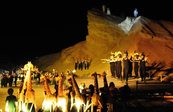 La puesta en escena reveló aprovechamiento de las geoformas del improvisado anfiteatro -ex estacionamiento del complejo- y mostró intermitente desplazamiento coreográfico -tan convincente como los casi 400 trajes en escena (jirafas, antílopes, monos, leonas y aves carroñeras, parte de la infante jungla textil)-.