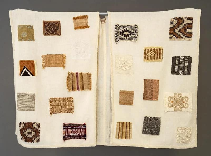 El requerimiento era hacer un cuadrado de 10 cm realizado en telar criollo plantado a pala, hilado a mano y en colores neutros. Patricia hizo una tela con lana de oveja hilada a mano, color gris y blanco, con una línea de esparragón (se usan dos colores en una sola línea, queda intercalado, explicó sobre la técnica). Por su parte, Elisa también usó lana de oveja gris con los detalles en blanco.