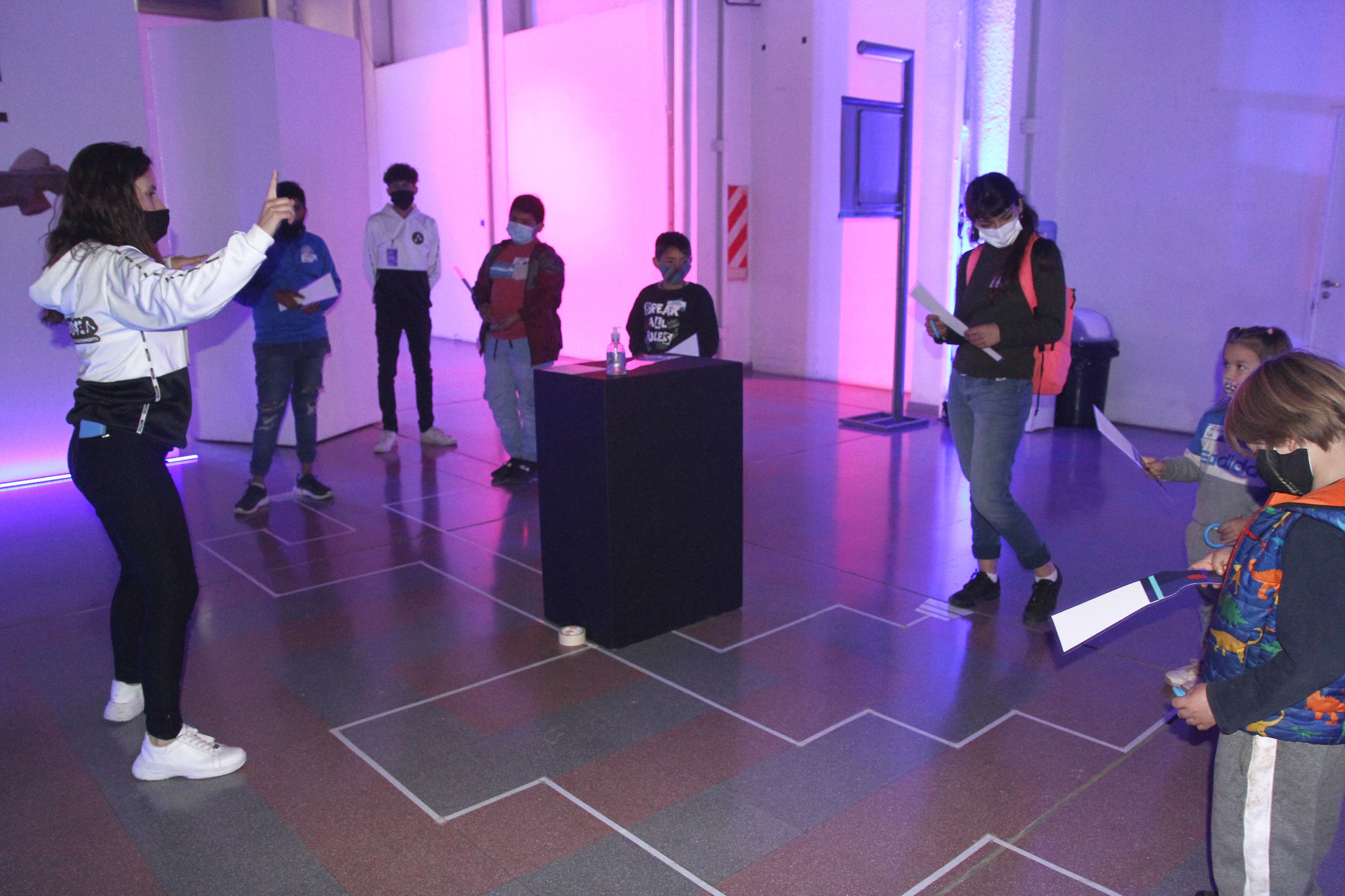 La experiencia es bastante personal, porque se realiza en grupos de seis participantes que pueden ser todos amigos o familiares, inscriptos previamente que ingresan cada 15 minutos, tiempo suficiente para que avancen entre las estaciones- que son siete- y no se junten, controlando la cantidad de público en cada estación el piso está marcado para favorecer el distanciamiento de los chicos.