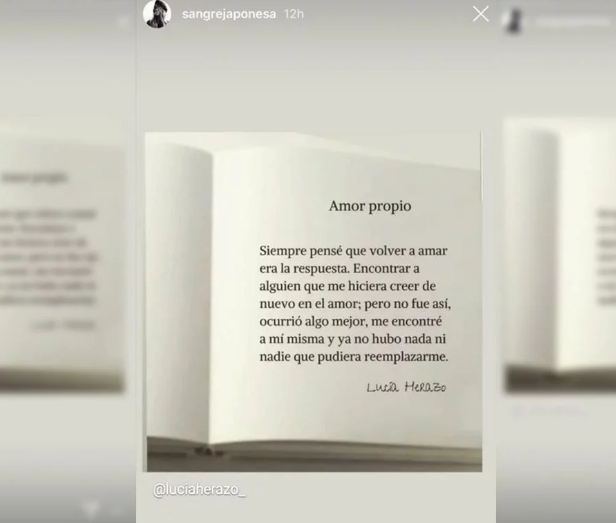 La China Suárez compartió a través de sus historias de Instagram un texto de Lucía Herazo llamado "Amor propio". “Siempre pensé que volver a amar era la respuesta. Encontrar a alguien que me hiciera creer de nuevo en el amor; pero no fue así", expresa la publicación. Y finaliza: "Ocurrió algo mejor, me encontré a mí misma y ya no hubo nada ni nadie que pudiera reemplazarme”.