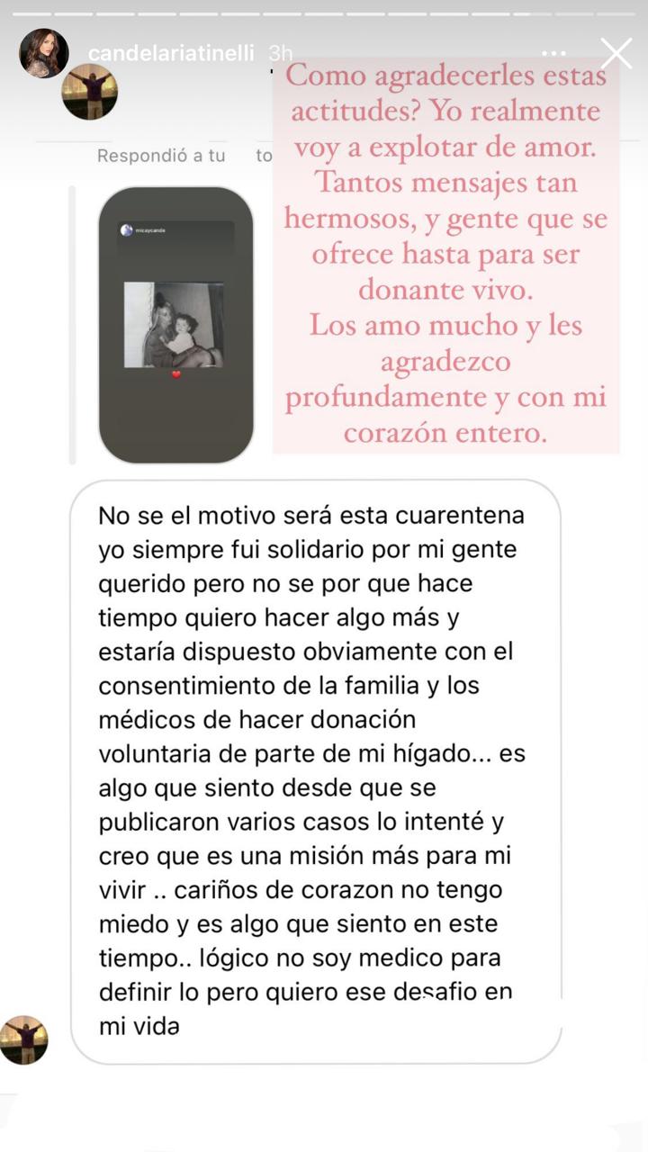 La cantante para compartir esto, mostró en sus historias la captura de la conversación con el mensaje del usuario que decía lo siguiente: “No sé el motivo, será esta cuarentena. Yo siempre fui solidario con mi gente, querido, pero no sé por qué hace tiempo quiero hacer algo más. Y estaría dispuesto obviamente, con el consentimiento de la familia y los médicos, de hacer donación voluntaria de parte de mi hígado”, le remarcó este hombre a Cande y continuó: