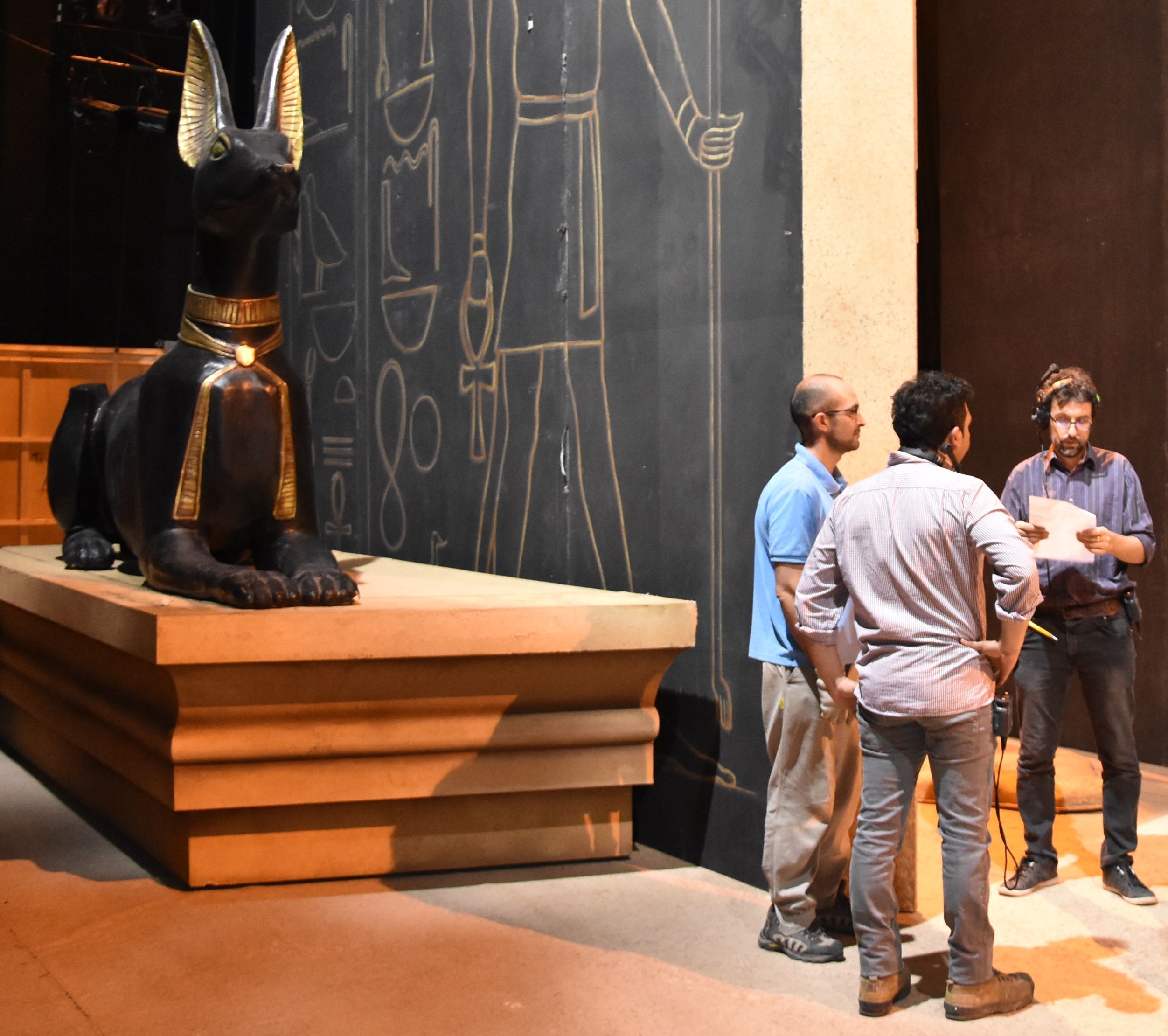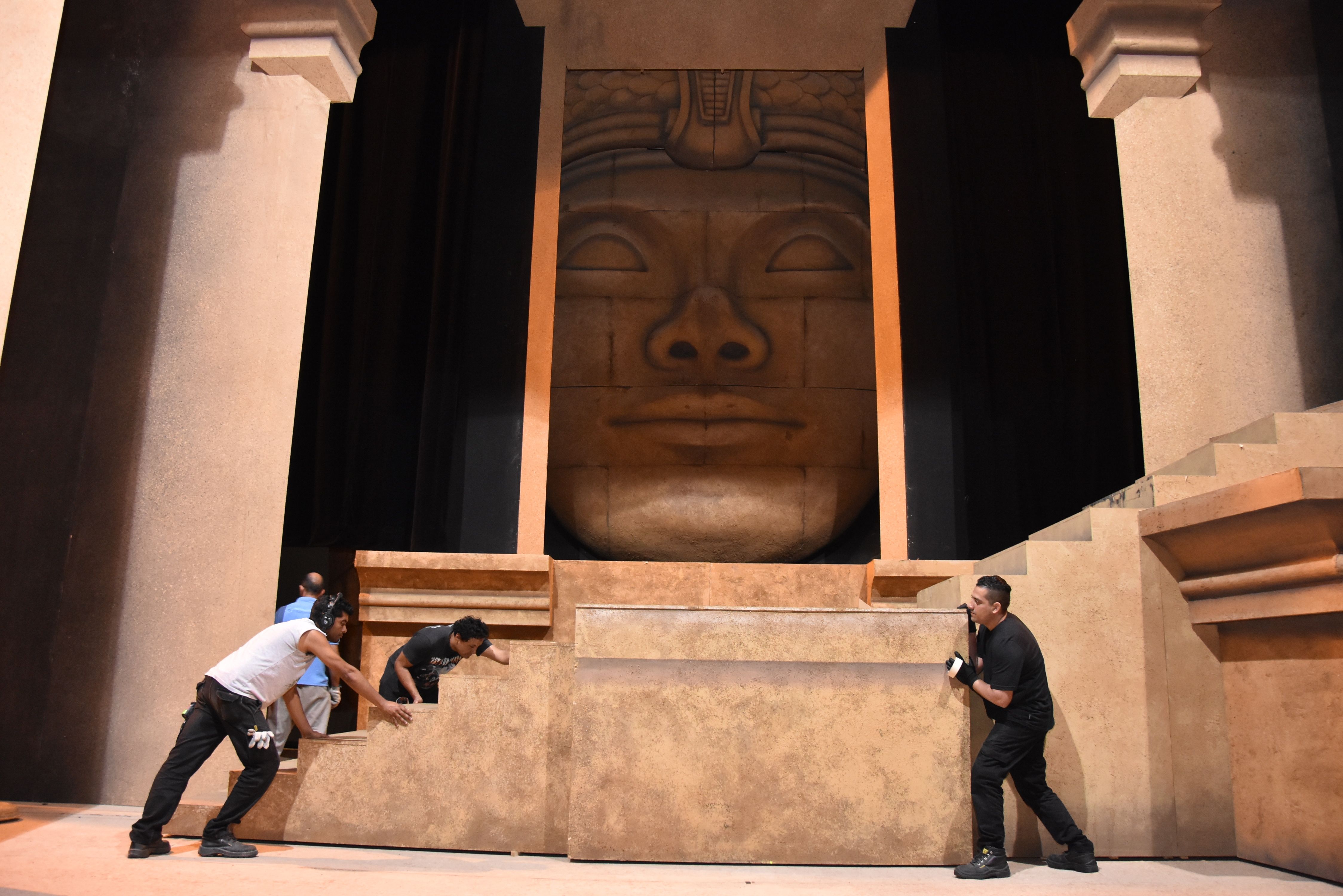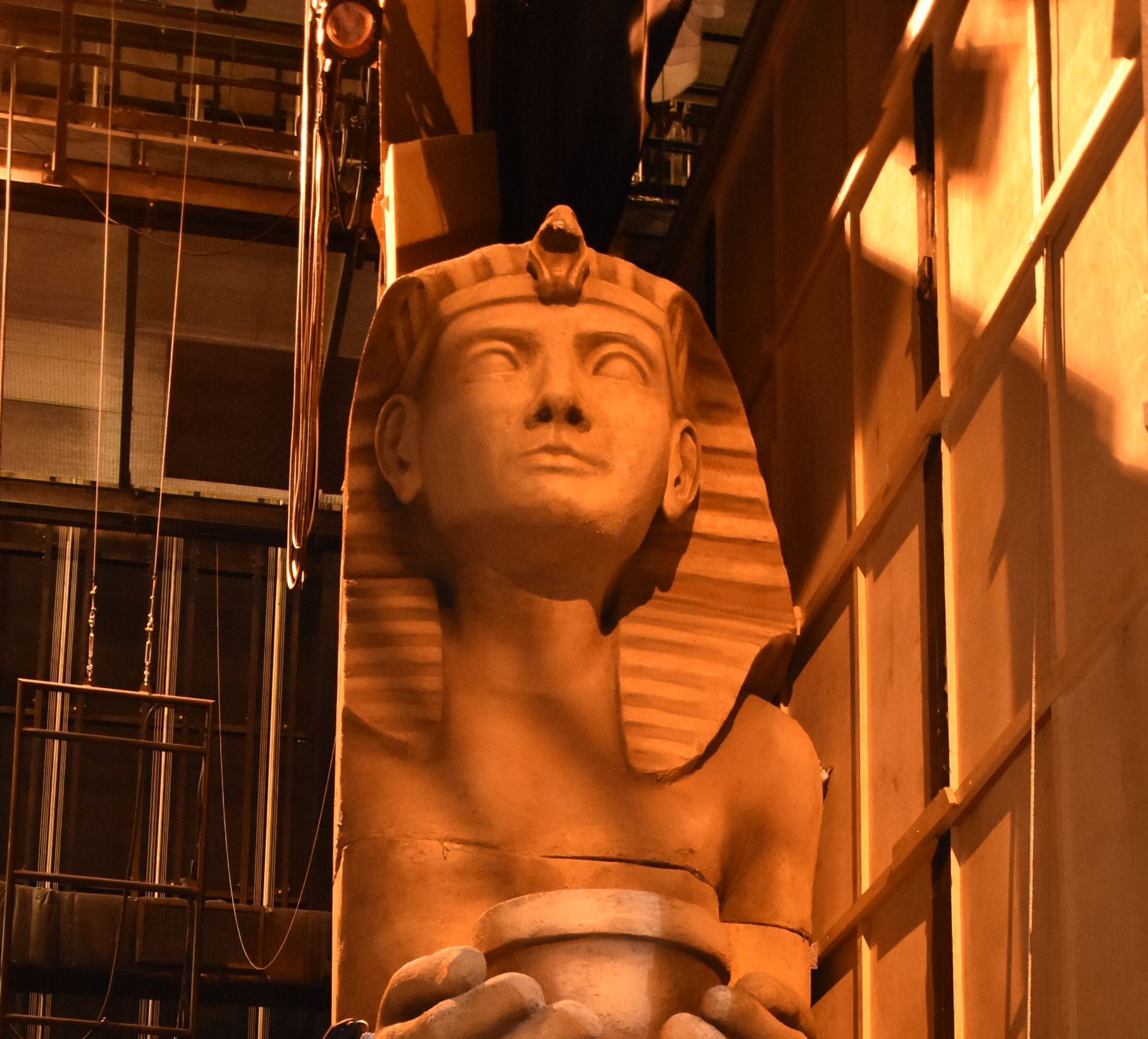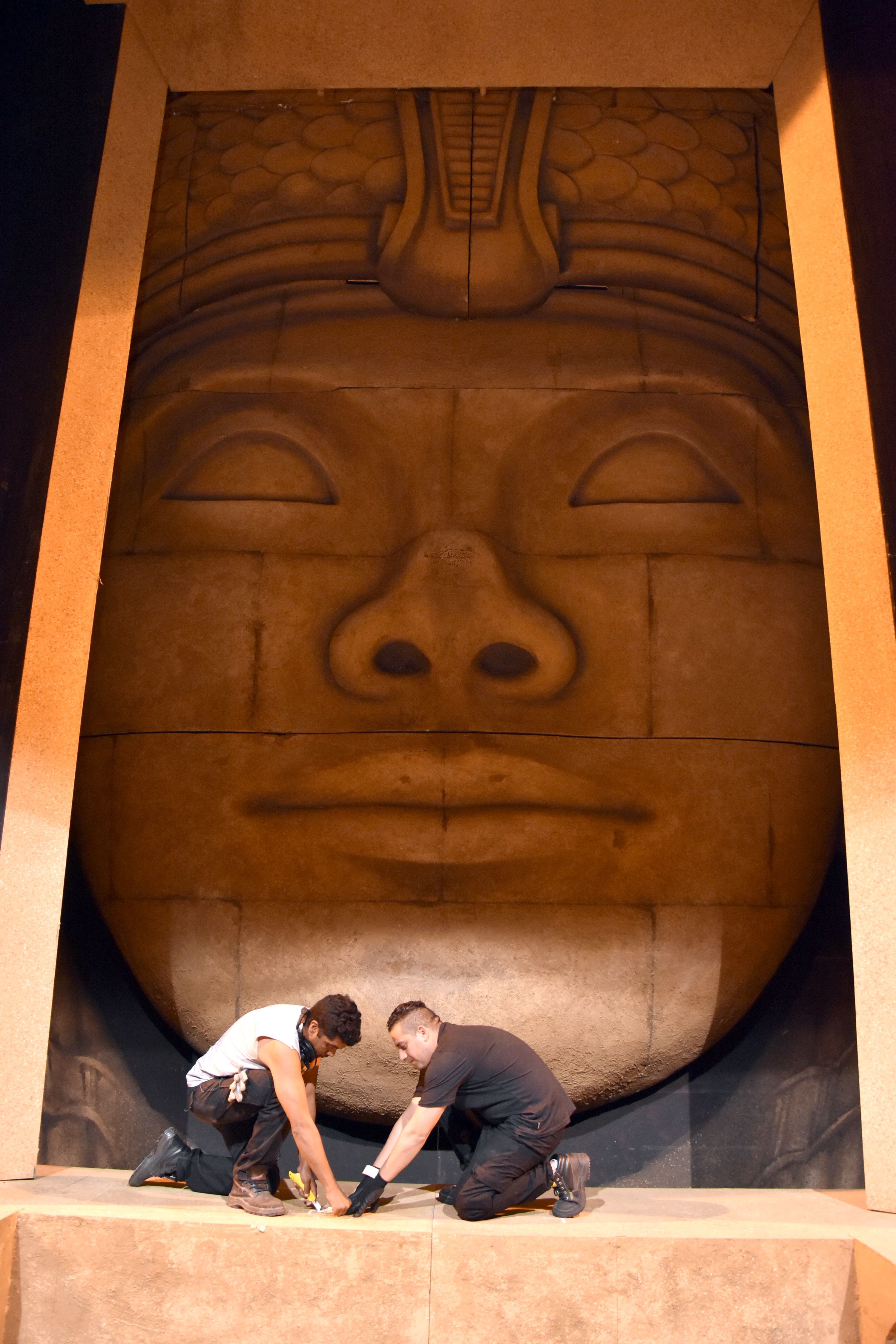 En apenas media hora, mientras cantantes y músicos hacen una pausa, los técnicos corren de un lado al otro, martillando y amoldando detalles para poner a punto las grandes esfinges que acapararán la vista de la platea simulando los interiores y las antesalas de templos y palacios -en especial, un gran rostro y los dos perros faraones en los laterales-, teniendo en foco la línea trazada previamente. Esculpidas en telgopor con una terminación en forrado, lustrado y pintura para dar sensación de piedra, mármol y aplicaciones en oro; las inmensas esculturas darán el toque de majestuosidad a este título, cuyo gran reto a nivel visual será reproducir la suntuosidad del antiguo Egipto.
