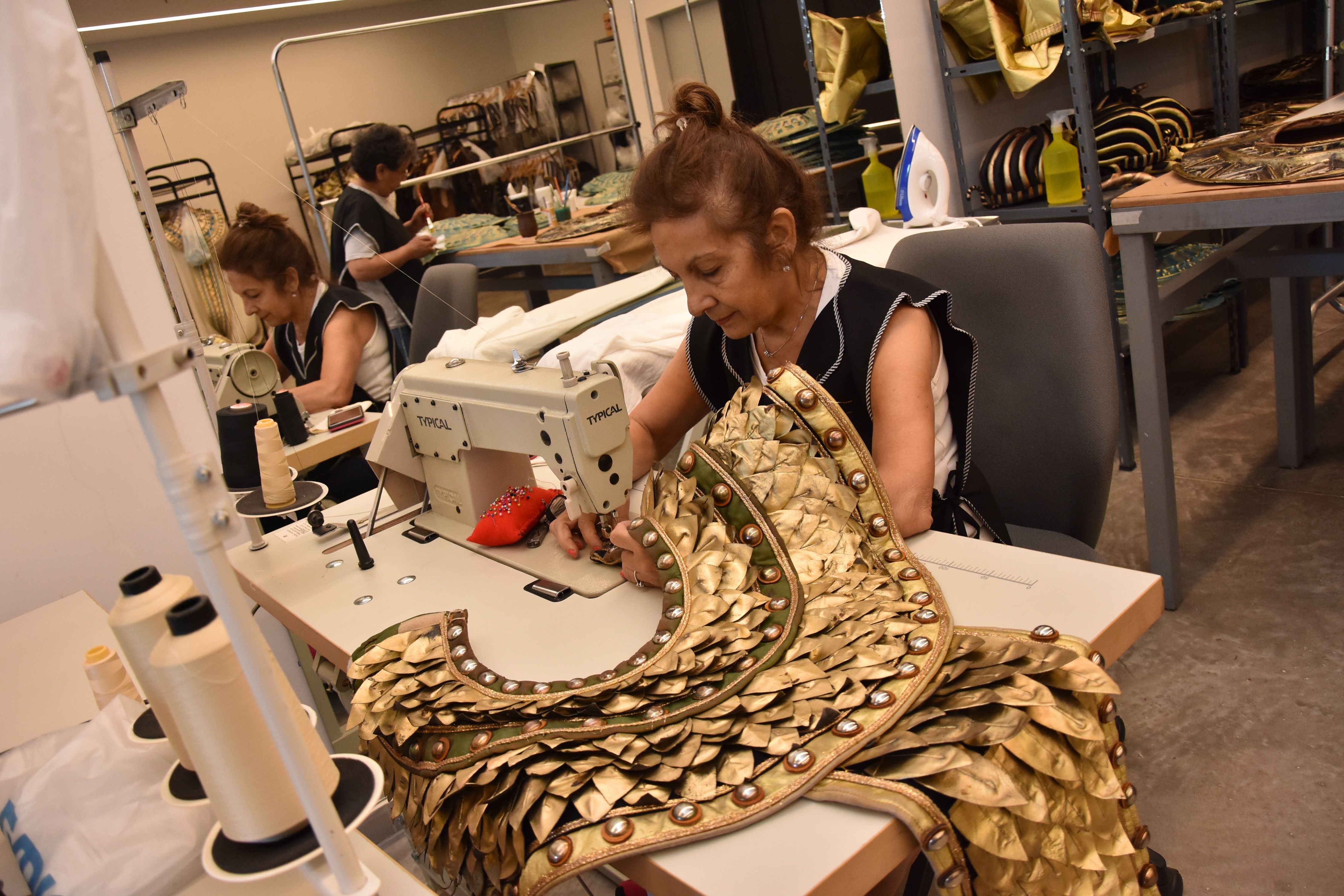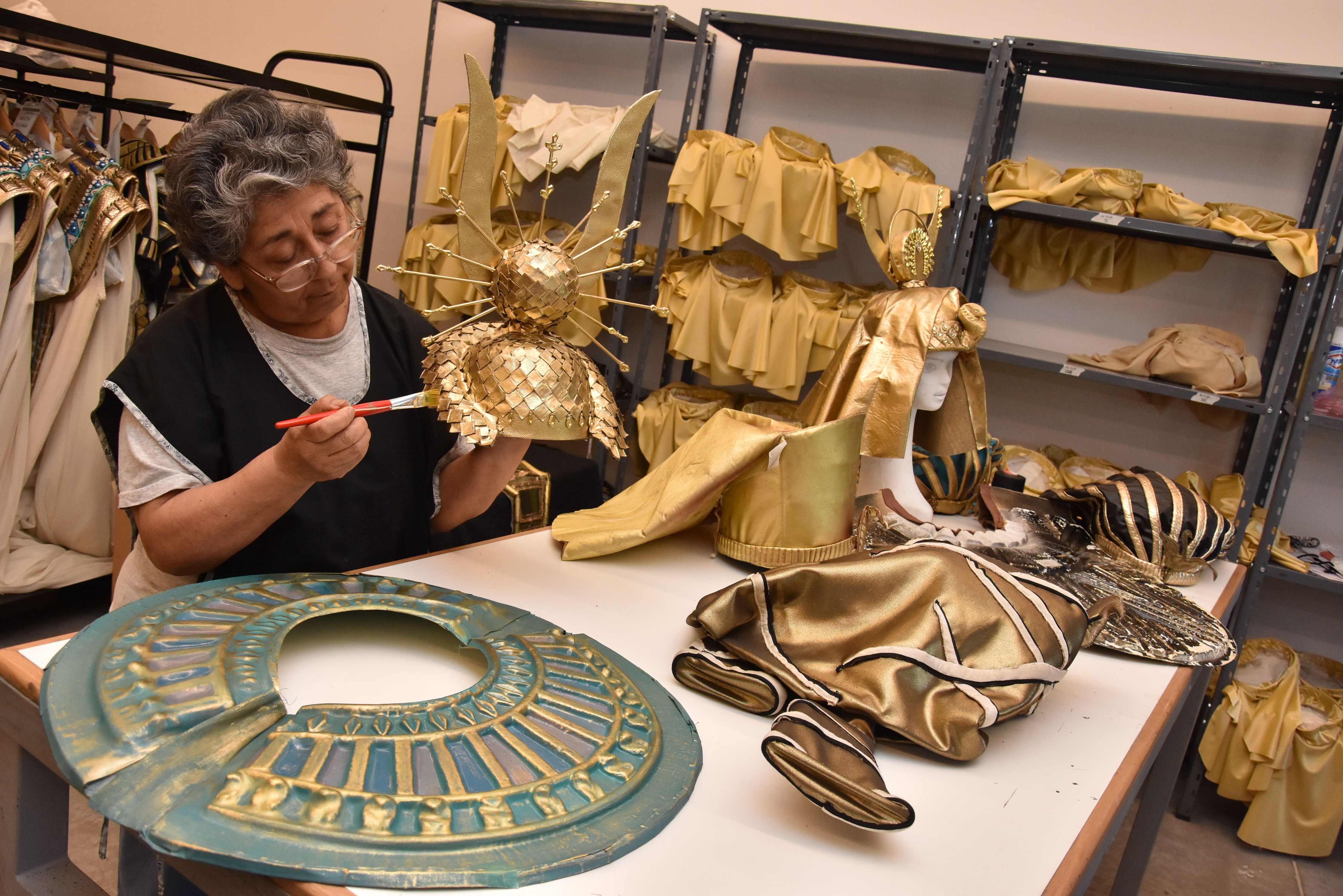 "Mientras los artistas ensayan, nosotros nos concentramos en terminar de remendar y pintar los cuellos de los faraones hechos en plástico, que ya estaban despintados por los años, utilizando cinta, acrílicos y pinceles, para que no se note tanto. También algunos cascos se hicieron acá, son de mano de obra local, los ajustamos a las cabezas con espuma de nylon", dijo Gladys Narváez, una de las costureras, mientras que Mónica Varas, otra de las compañeras, cose a mano la cuerina de una pechera que asemeja estar bordada con laureles, después de acortar la altura.